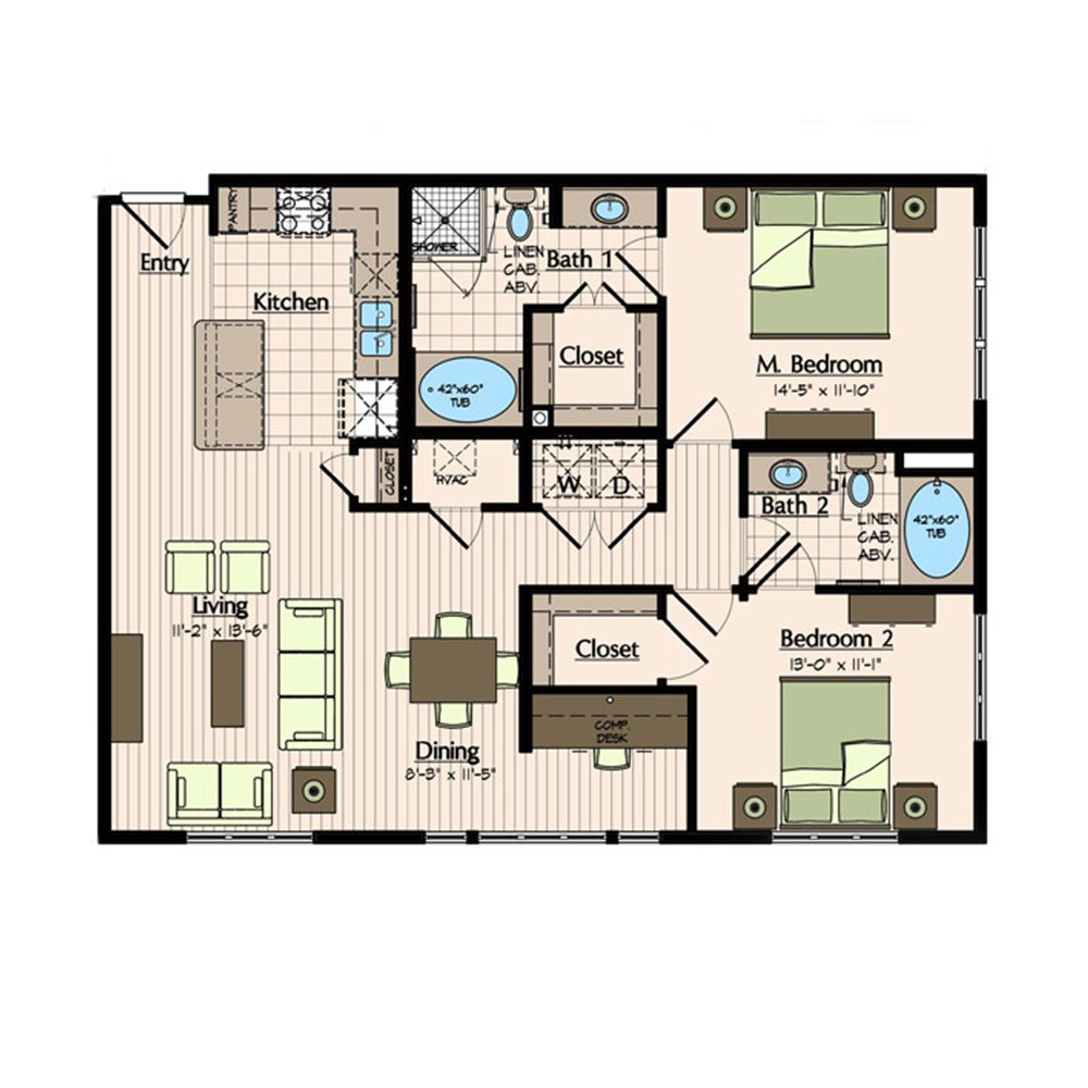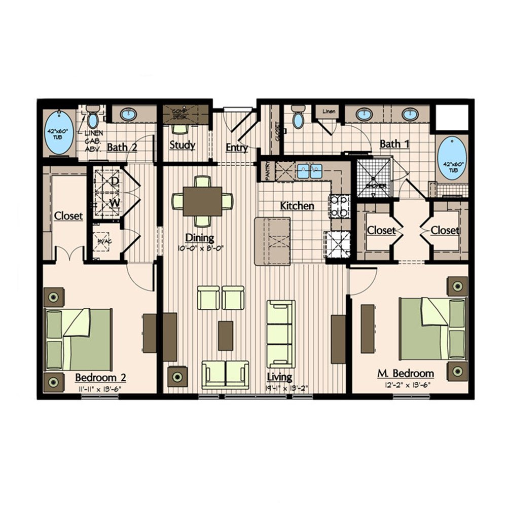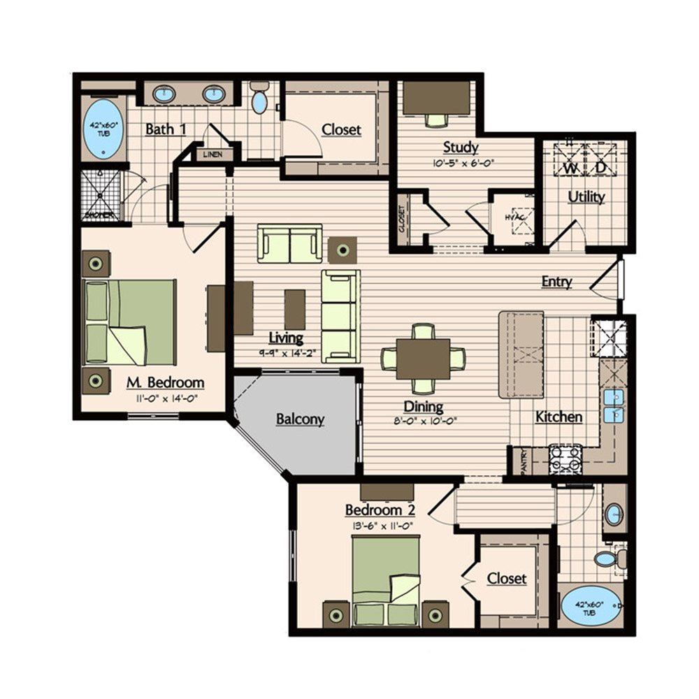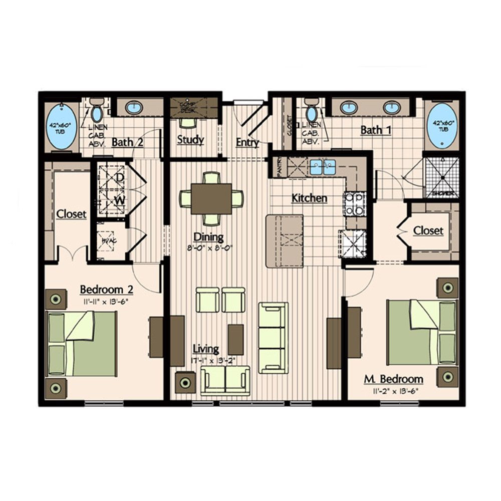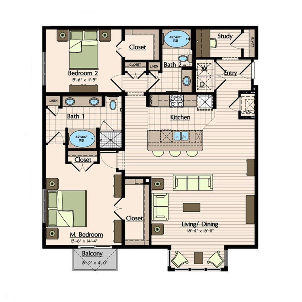 2 Bed, 2 Bath With Study | 1,400 S.F.