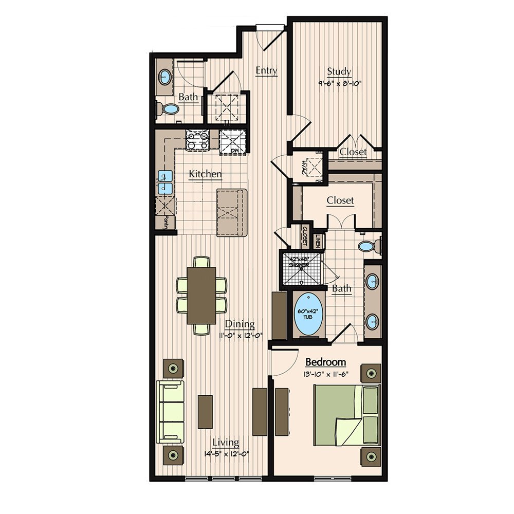 1 Bed, 1.5 Bath with Study | 1,158 S.F.